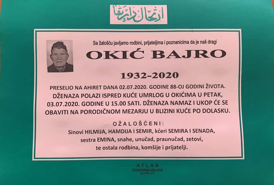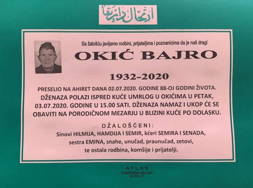 Dženaza namaz polazi ispred kuće umrlog u Okićima u petak 03.07.2020.godine u 15:00 sati. Dženaza namaz i ukop će se obaviti na porodičnom mezarju u blizini kuće po dolasku.