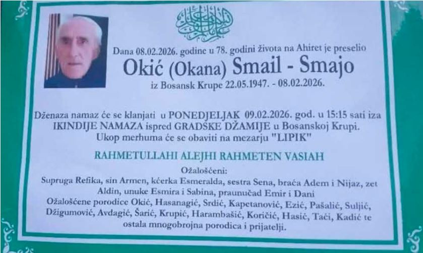 Dženaza-namaz će se klanjati u PONEDJELJAK 09.02.2026. godine u 15:15 sati, iza IKINDIJE NAMAZA ispred GRADSKE DŽAMIJE u Bosanskoj Krupi.