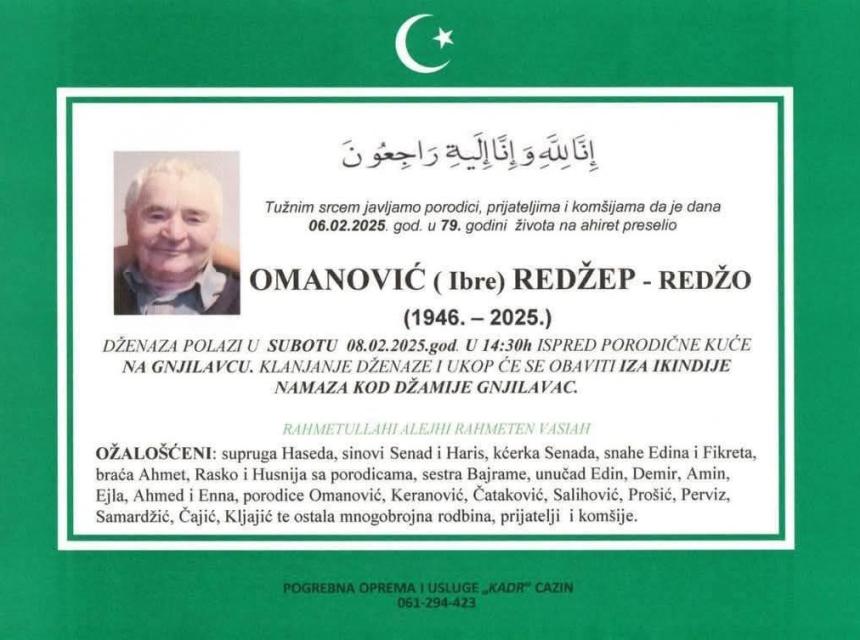Duboko ožalošćeni obavještavamo rodbinu, prijatelje i komšije da je dana 06.02.2025. god. u 79-oj godini života na ahiret preselio Omanović (Ibre) Redžep- Redžo.