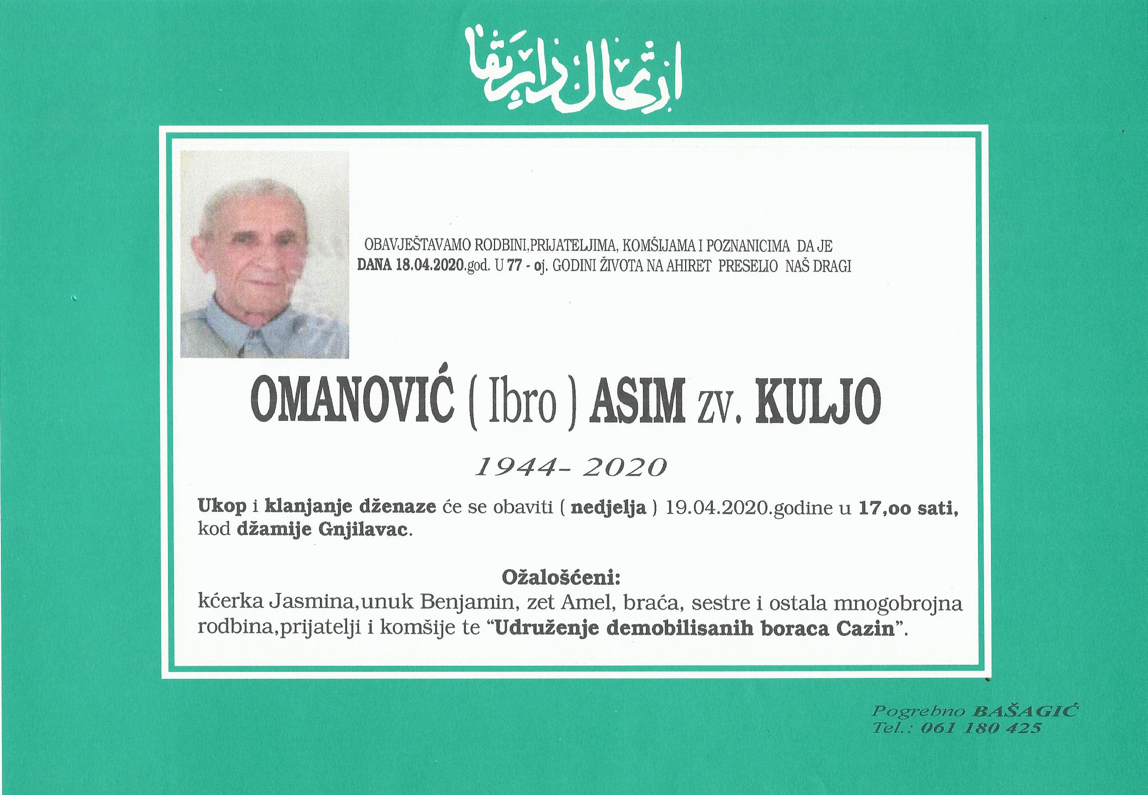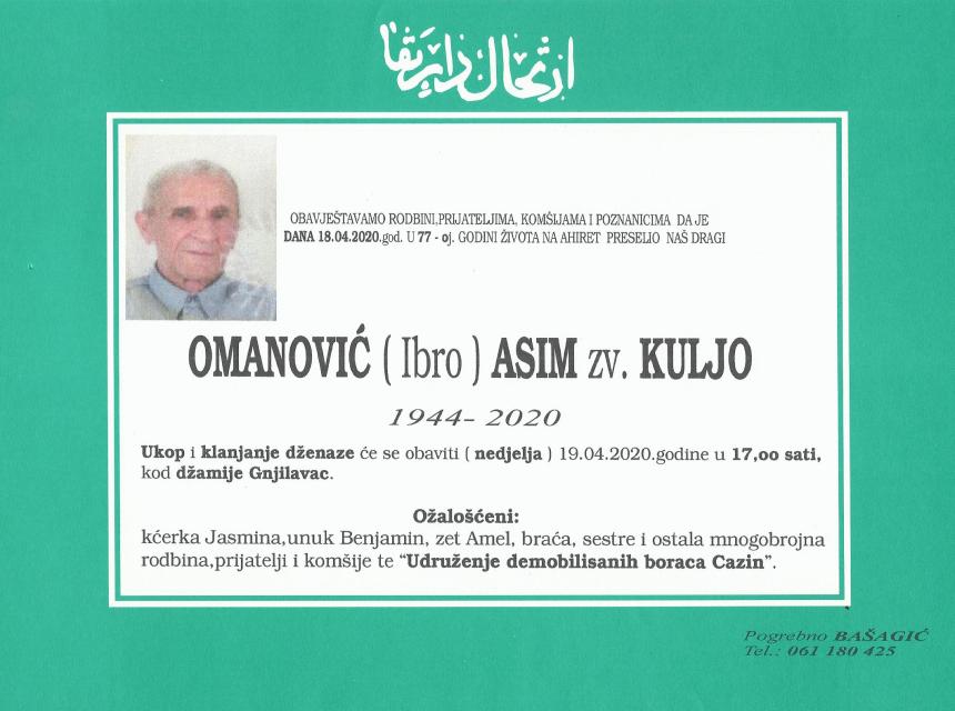 Teškim srcem i bolom u duši javljamo da je naš dragi i nikad prežaljeni Omanović (Ibro) Asim dana 18.04.2020.godine u 77-oj godini života preselio na Ahiret.