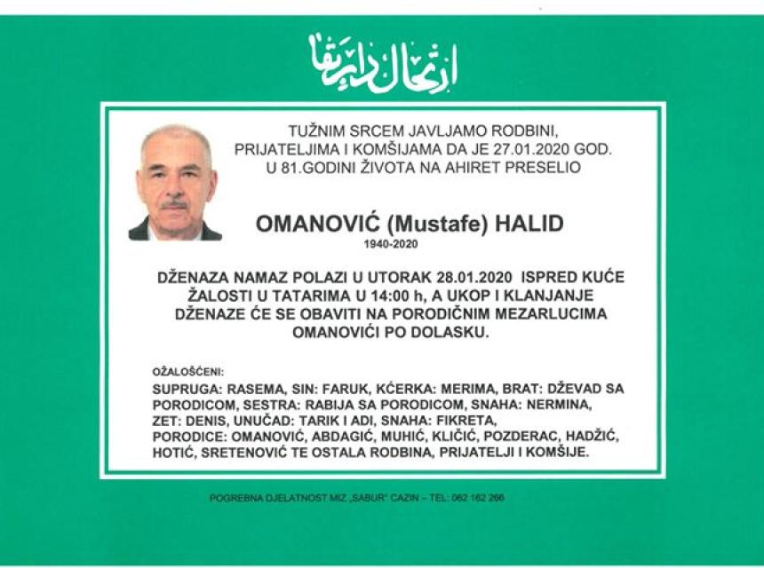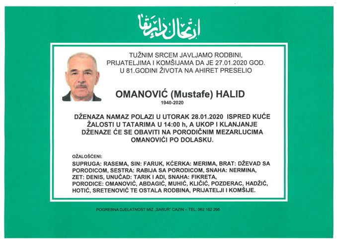 Tužnim srcem i bolom u duši javljamo rodbini i prijateljima da je dana 27.01.2020. godine u 81-oj godini života, na Ahiret preselio Omanović (Mustafe) Halid.