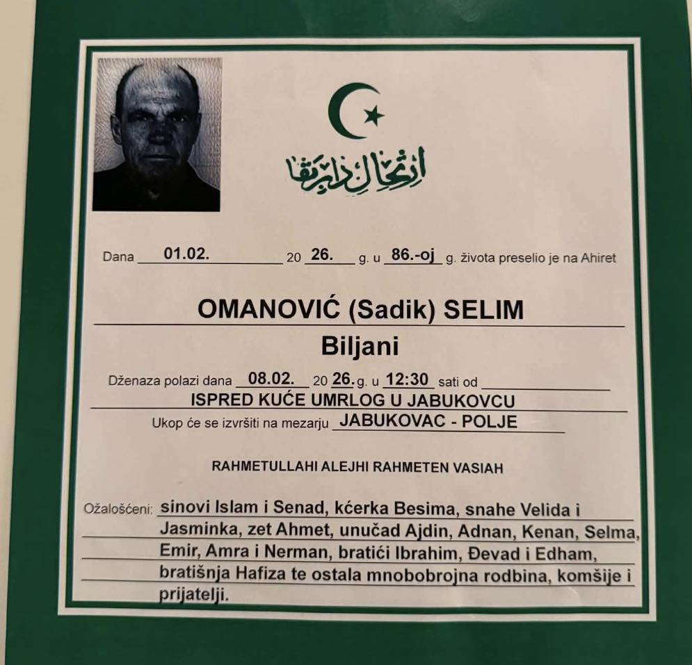 Dženaza polazi dana 08.02.2026. godine u 12:30 sati od ISPRED KUĆE UMRLOG U JABUKOVCU. Ukop će se izvršiti na mezarju JABUKOVAC - POLJE.
