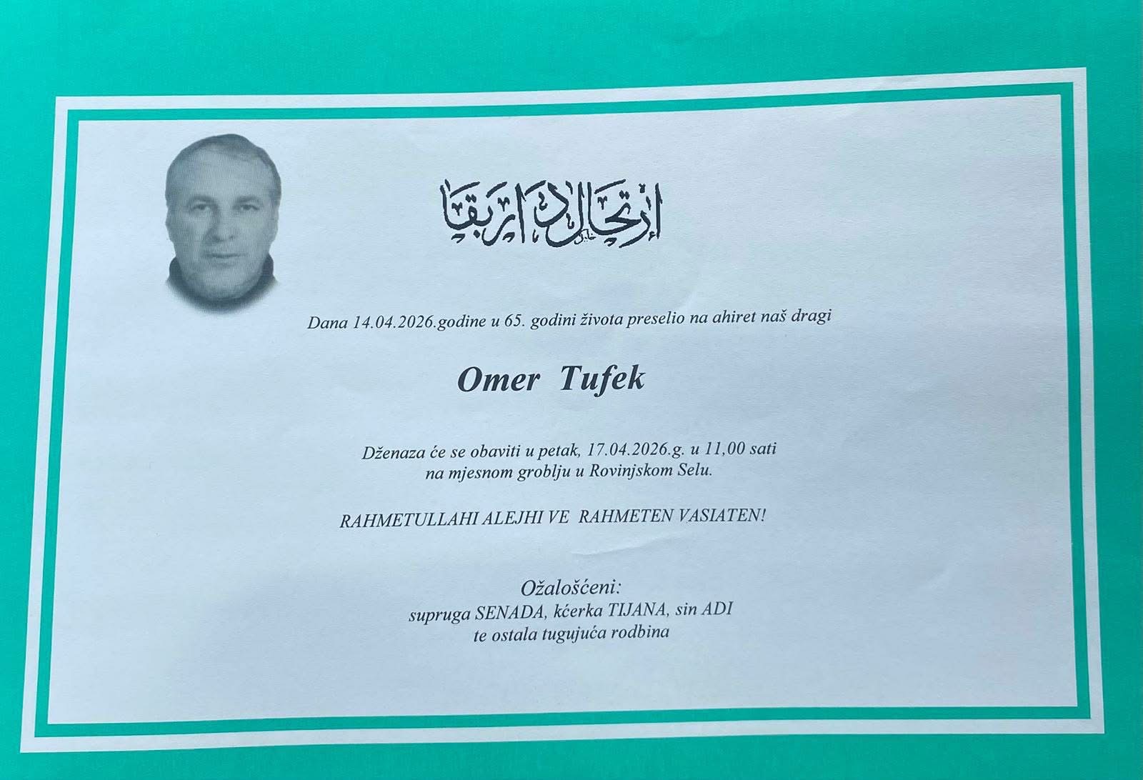 Dženaza će se obaviti u petak, 17.04.2026. godine u 11,00 sati na mjesnom groblju u Rovinijskom Selu.