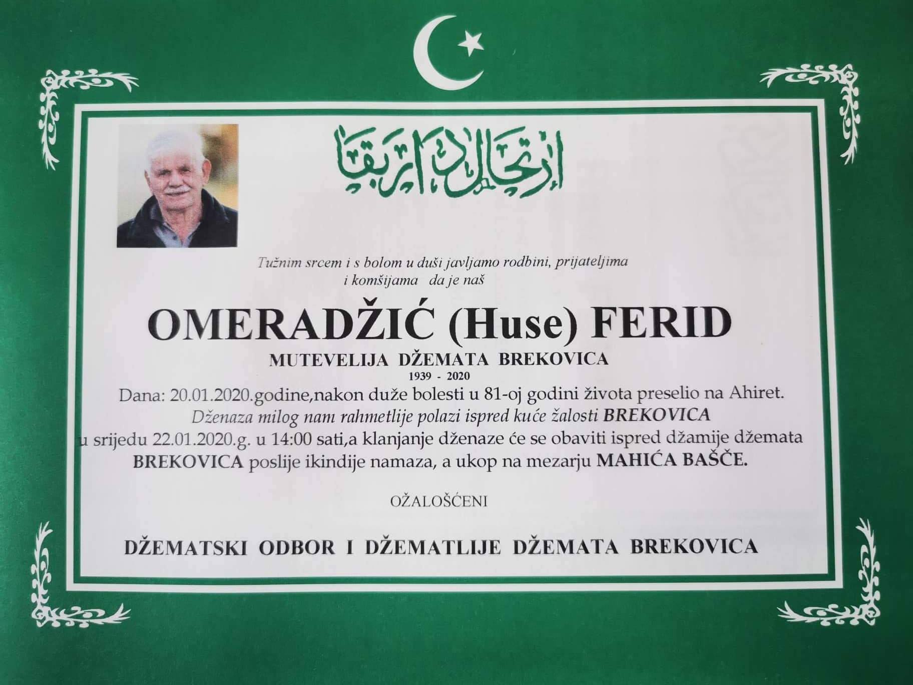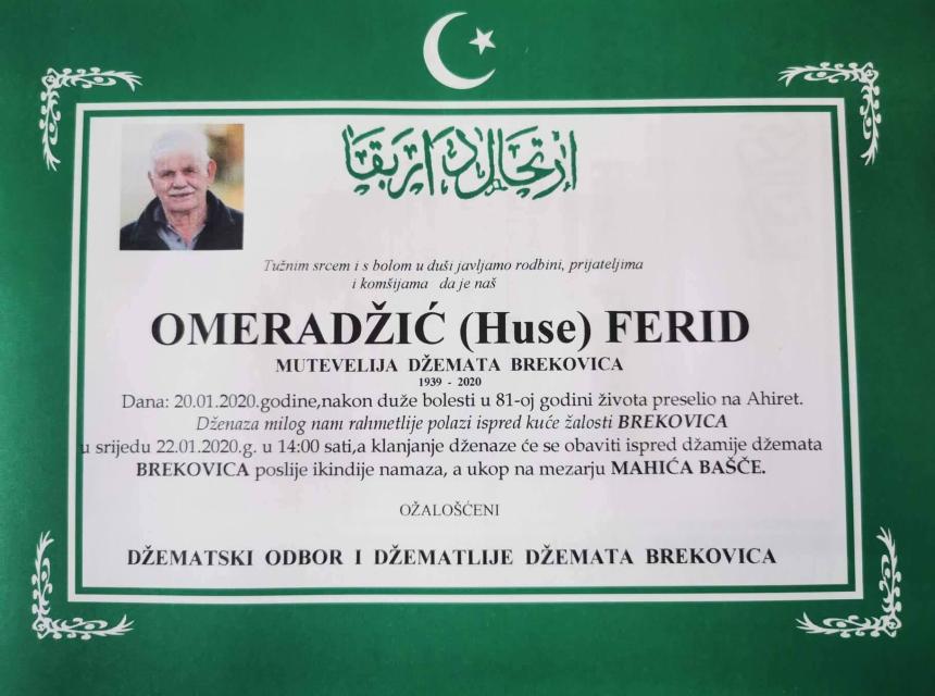 Tužnim srcem i bolom u duši javljamo rodbini i prijateljima da je naš dragi i nikad prežaljeni Omeradžić (Huse) dana 20.01.2020. godine u 81-toj godini života preselio na Ahiret.