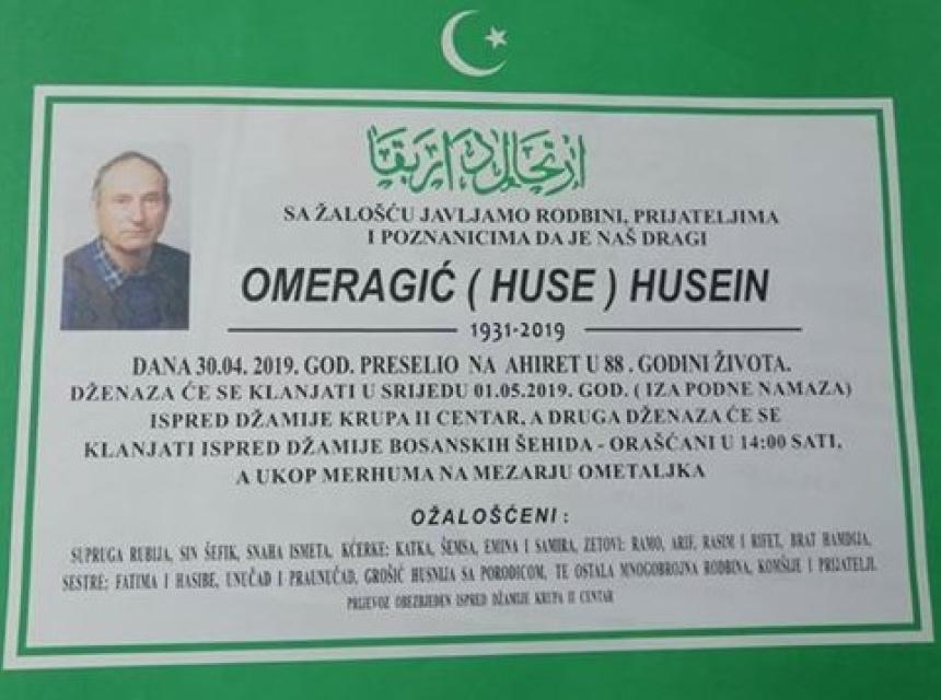Tužnim srcem i bolom u duši javljamo rodbini, prijateljima, komšijama i poznanicima da je dana 30.04.2019. godine u 88.-oj godini života na Ahiret preselio naš dragi Omeragić (Huse) Husein.