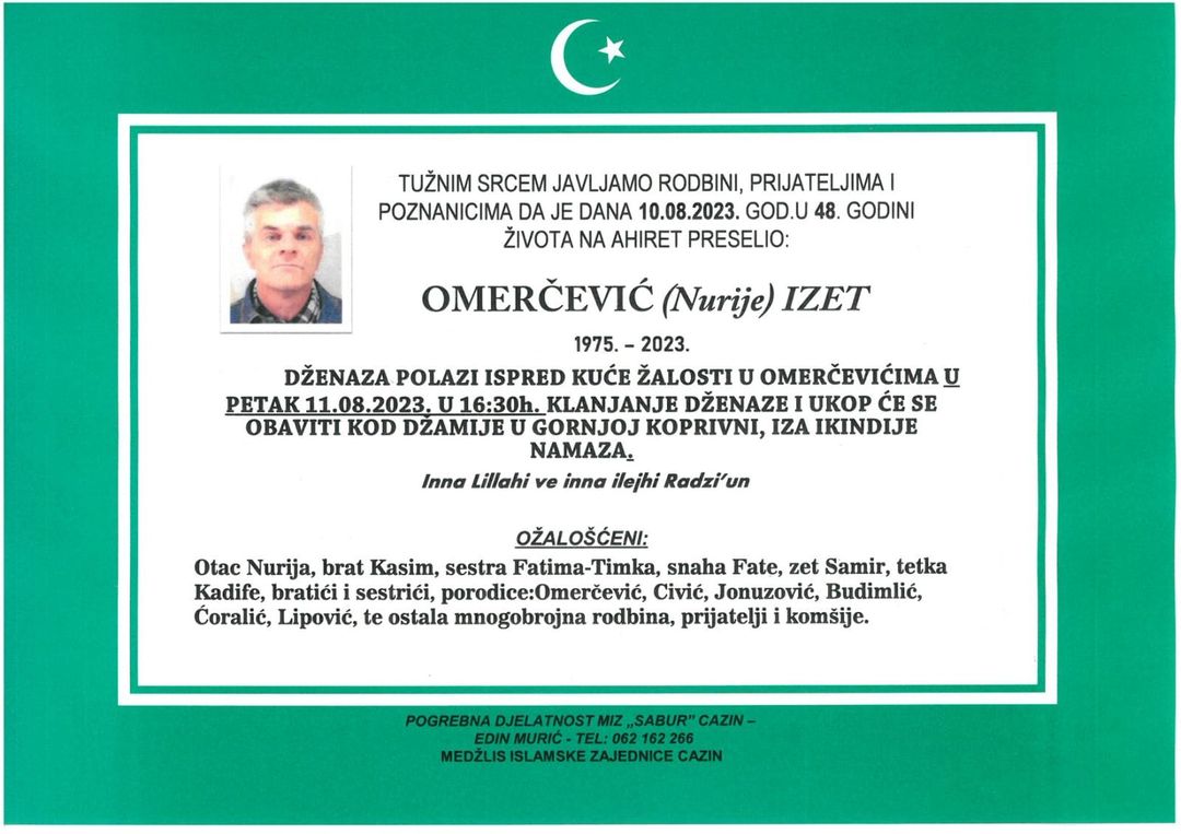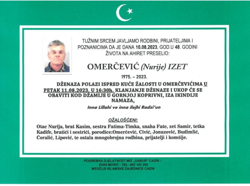 Tužnim srcem i bolom u duši javljamo rodbini, prijateljima i poznanicima da je naš dragi Omerčević (Nurije) Izet, dana 10.08.2023. godine u 48-oj godini života, preselio na Ahiret.