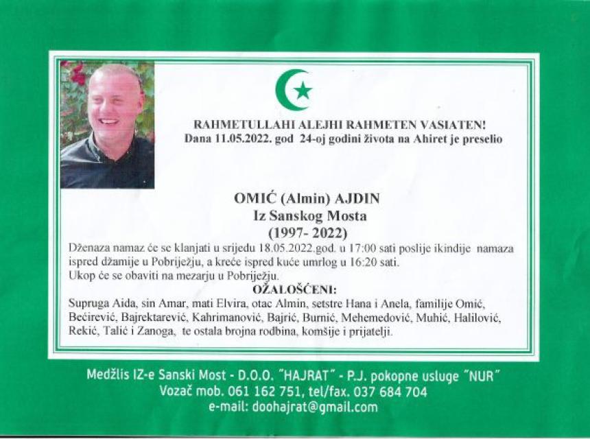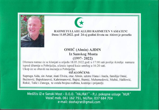 Tužnog srca i s bolom u duši obavještavamo rodbinu, komšije i prijatelje da je naš dragi Omić (Almin) Ajdin u 24. godini života preselio na Ahiret.