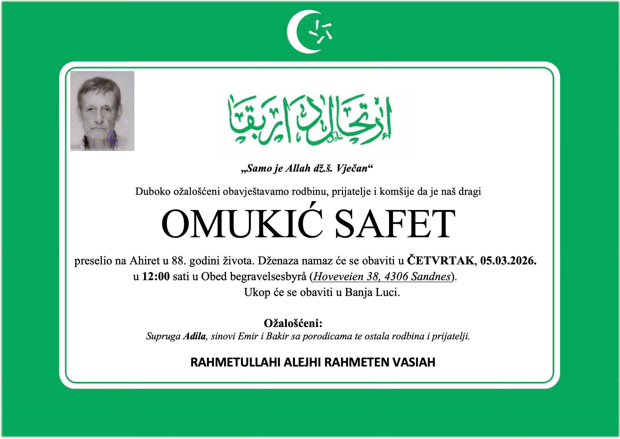 preselio na Ahiret u 88. godini života. Dženaza-namaz će se obaviti u ČETVRTAK, 05.03.2026. u 12:00 sati u Obed begravelsesbyrå (Hoveveien 38, 4306 Sandnes).