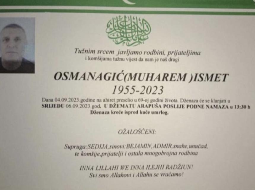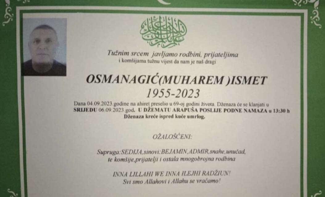 Tužnim srcem javljamo rodbini, prijateljima i komšijama tužnu vijest da nam je naš dragi OSMANAGIĆ (MUHAREM )ISMET dana 04.09.2023.godine na ahiret preselio u 69-oj godini života