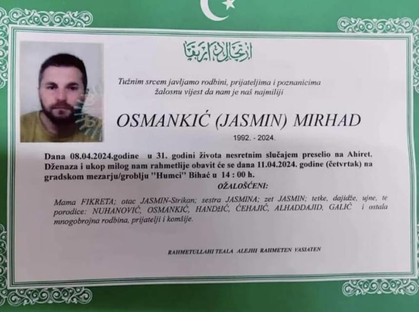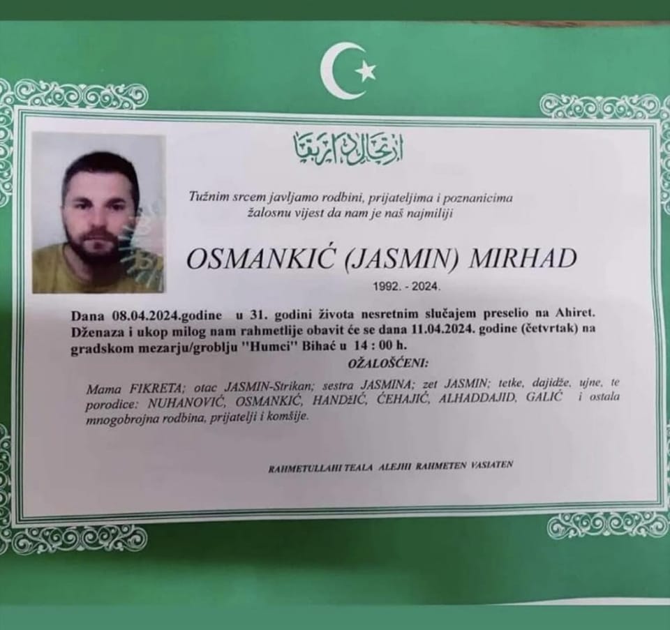 Tužnim srcem javljamo rodbini, prijateljima i komšijama žalosnu vijest da nam je naš dragi Osmankić (Jasmin) Mirhad dana 08. 04. 2024. godine u 31. godini života nesretnim slučajem preselio na Ahiret.