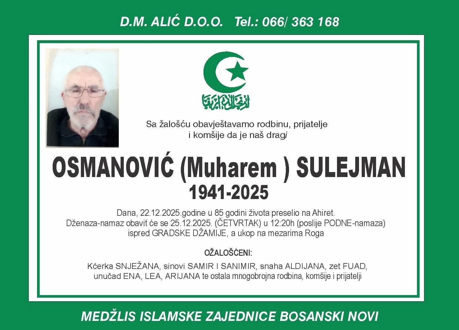 Dženaza-namaz obavit će se 25.12.2025. (četvrtak) u 12:20 h (poslije podne-namaza) ispred Gradske džamije, a ukop će se obaviti na mezarima Roga.