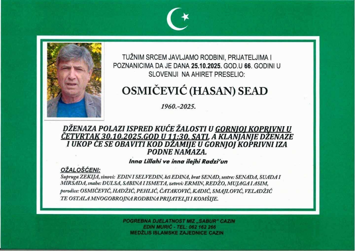 DŽENAZA POLAZI ISPRED KUĆE ŽALOSTI U GORNJOJ KOPRIVNI U ČETVRTAK 30.10.2025. GOD. U 11:30 SATI, A KLANJANJE DŽENAZE I UKOP ĆE SE OBAVITI KOD DŽAMIJE U GORNJOJ KOPRIVNI IZA PODNE NAMAZA.