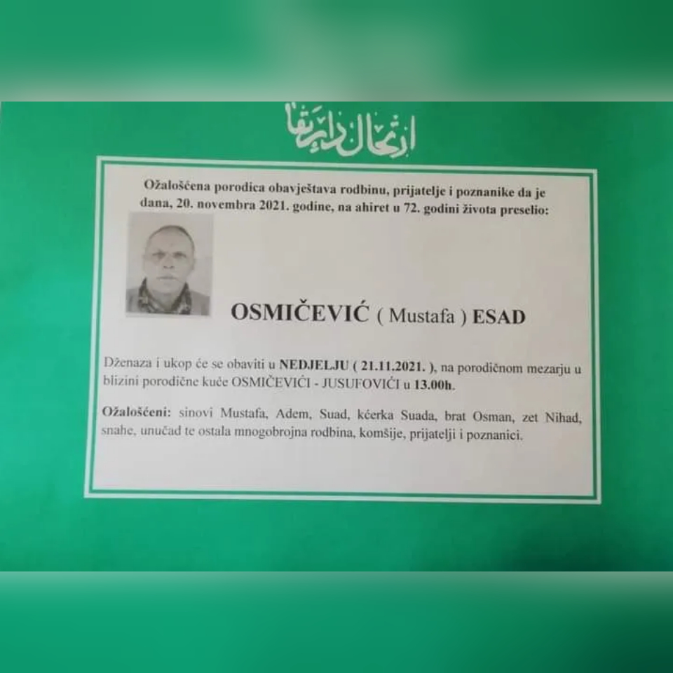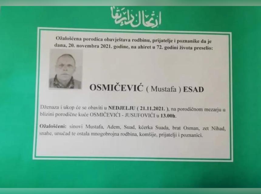 Tužnog srca i s bolom u duši obavještavamo rodbinu, komšije i prijatelje da je naš dragi Osmičević (Mustafa) Esad dana 20.11.2021. u 72. godini života preselio na ahiret.