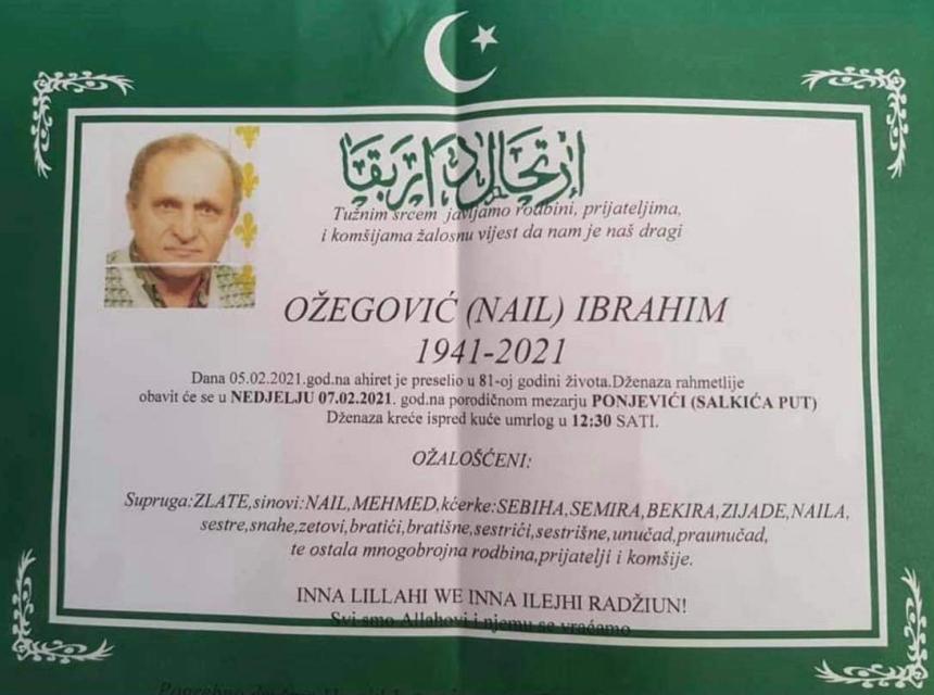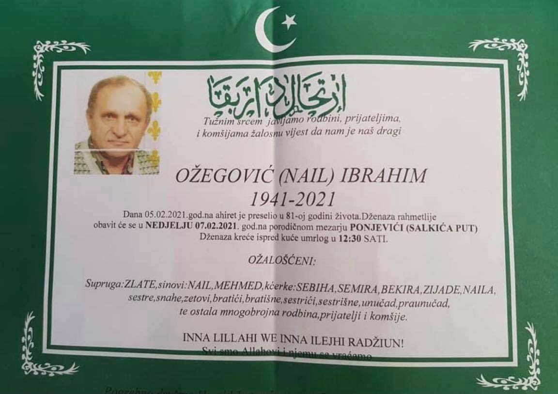 Tužnog srca i s bolom u duši obavještavamo rodbinu, komšije i prijatelje da je naš dragi Ožegović (Nail) Ibrahim 05.02.2021. godine, u 81. godini života preselio na Ahiret.
