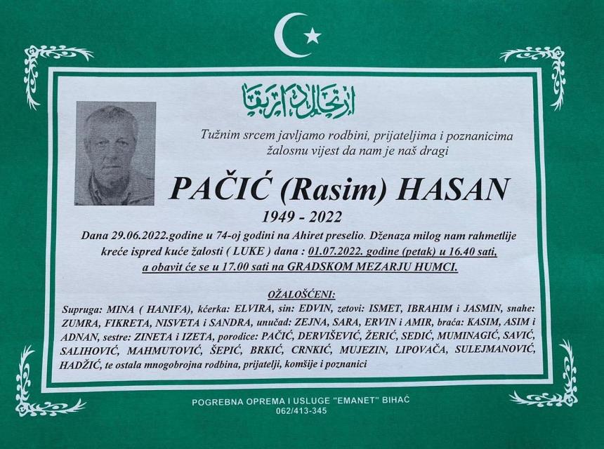 Tužnim srcem i bolom u duši javljamo rodbini, prijateljima i poznanicima da je naš dragi Pačić (Rasim) Hasan, dana 29.06.2022.godine. u 74- oj godini preselio na Ahiret.