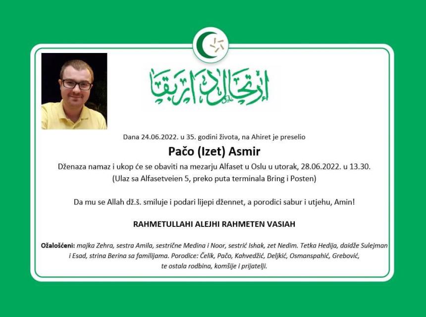 Tužnog srca i s bolom u duši obavještavamo rodbinu, komšije i prijatelje da je naš dragi Pačo (Izet) Asmir preselio na Ahiret u 35-oj godini života.