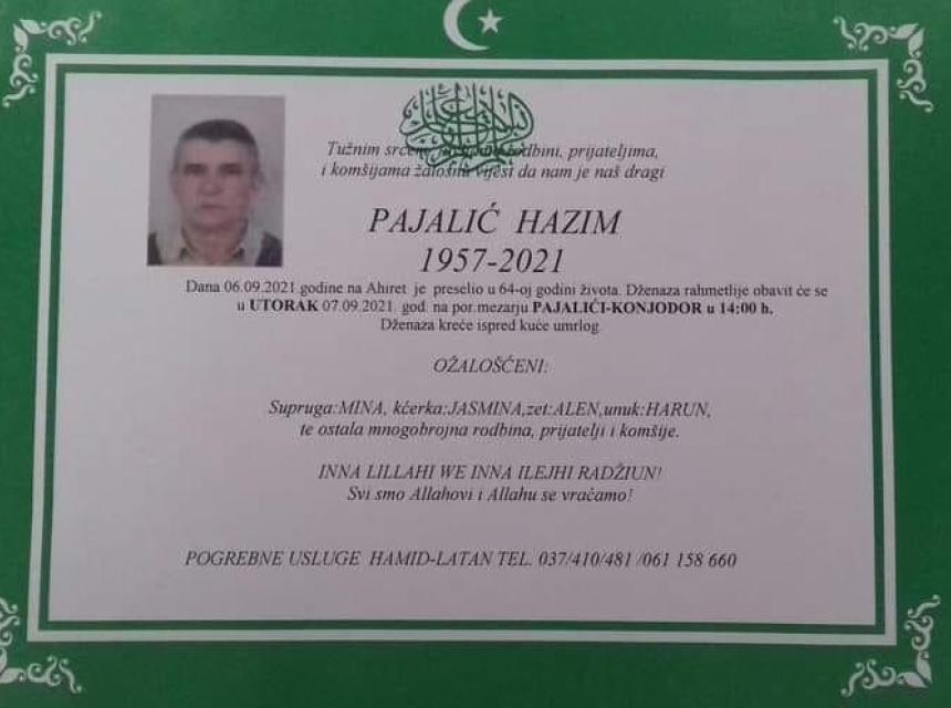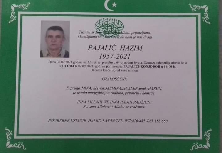 Dženaza namaz polazi u utorak 07.09.2021 godine na por. mezarju Pajalići - Konjodor u 14:00. Dženaza kreće ispred kuće umrlog.