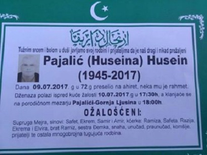Tužnim srcem i bolom u duši javljamo rodbini, prijateljima, komšijama i poznanicima da je naš dragi Pajalić (Huseina) Husein dana 09.07.2017.godine u 72-oj godini života preselio na Ahiret.