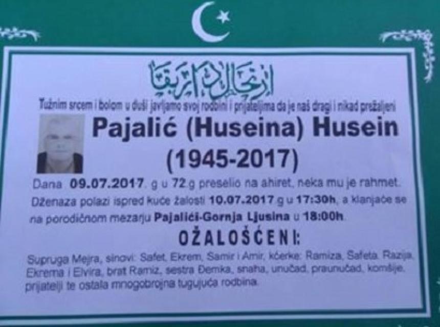 Dženaza polazi 10.07.2017.godine u 17:30 sati ispred kuće žalosti, a klanjat će se na porodičnom mezarju Pajalići-Gornja Ljusina u 18:00 sati.
