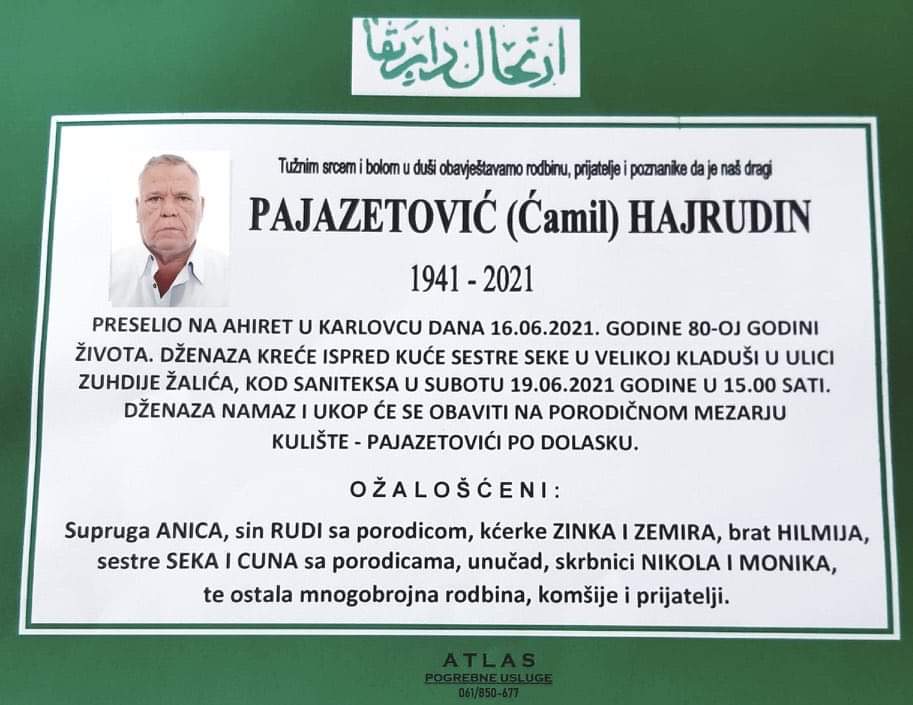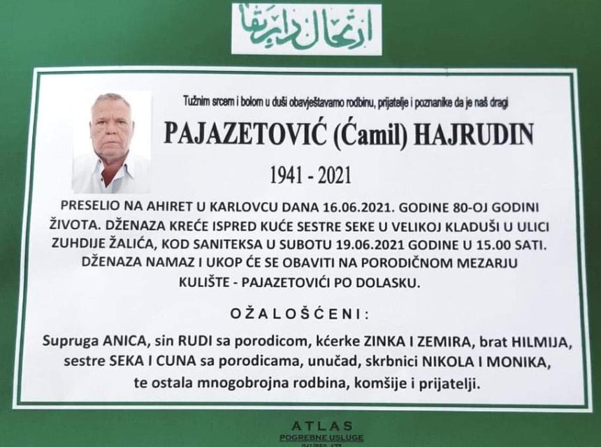Tužnog srca i s bolom u duši obavještavamo rodbinu, komšije i prijatelje da je naš dragi Pajazetović (Ćamil) Hajrudin , dana 16.06.2021. godine, u 80-oj godini života, preselio na ahiret.