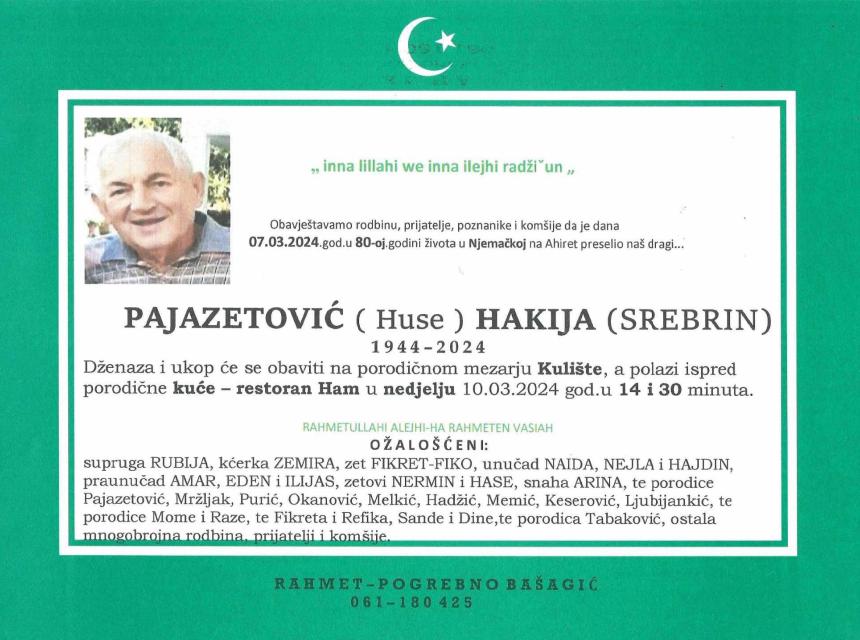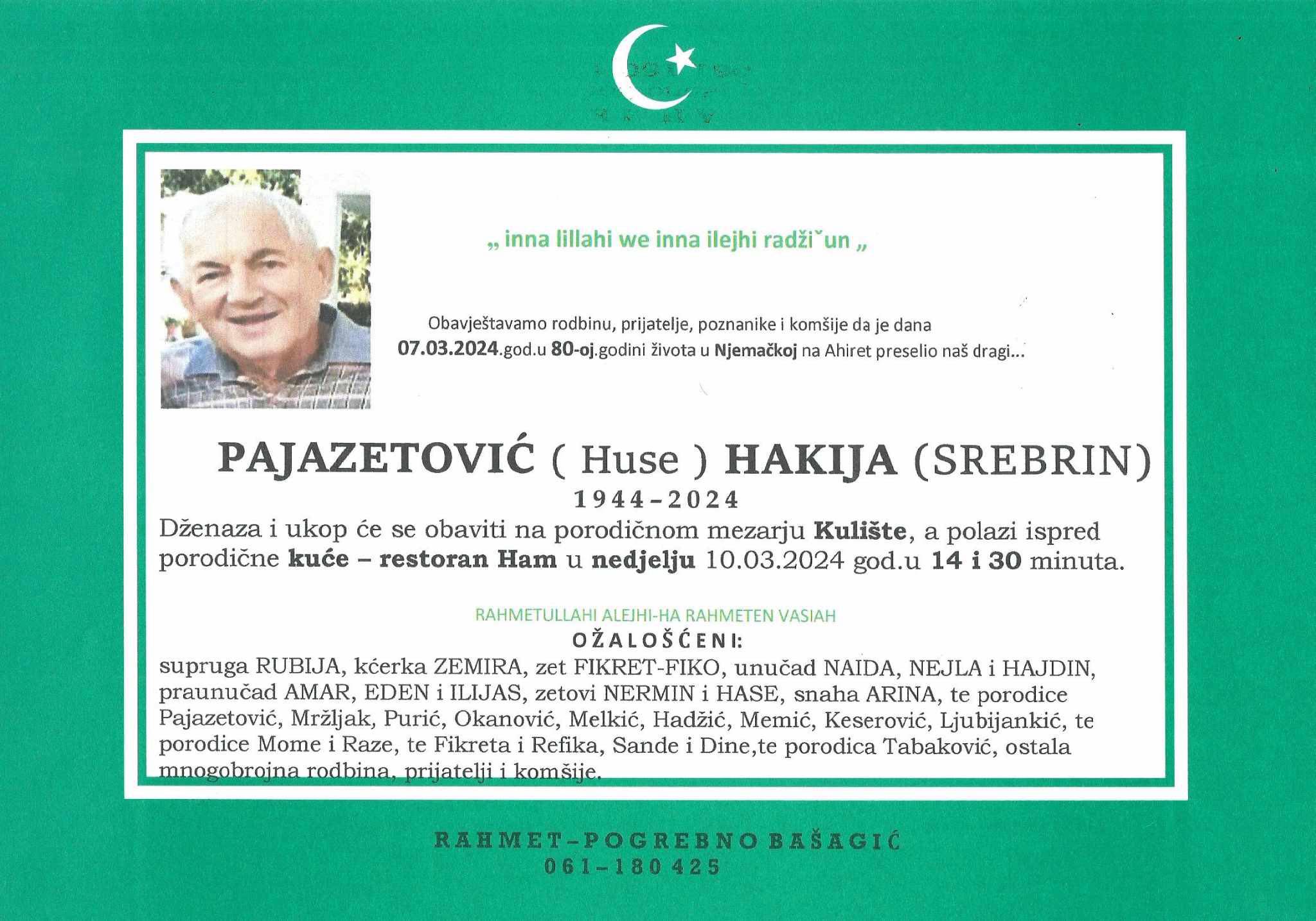 Tužnim srcem javljamo rodbini, prijateljima i komšijama da je naš dragi Pajazetović (Huse) Hakija (Srebrin) dana 07.03.2024.g. preselio na Ahiret u 80. godini.