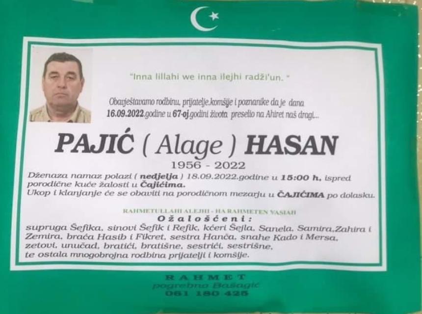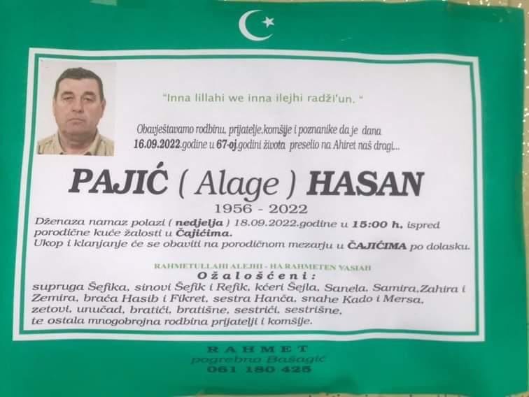 Tužnog srca i s bolom u duši obavještavamo rodbinu, komšije i prijatelje da je naš dragi Pajić (Alage) Hasan u 67. godini života preselio na Ahiret.