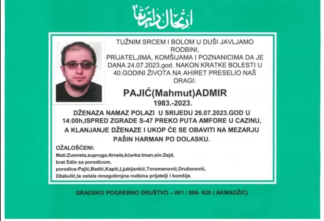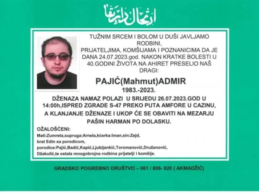 Tužnim srcem javljamo rodbini, prijateljima i komšijama tužnu vijest da nam je naš dragi Pajić (Mahmut) Admir dana 24.07.2023 godine preselio na ahiret preselio u 40-oj godini zivota.