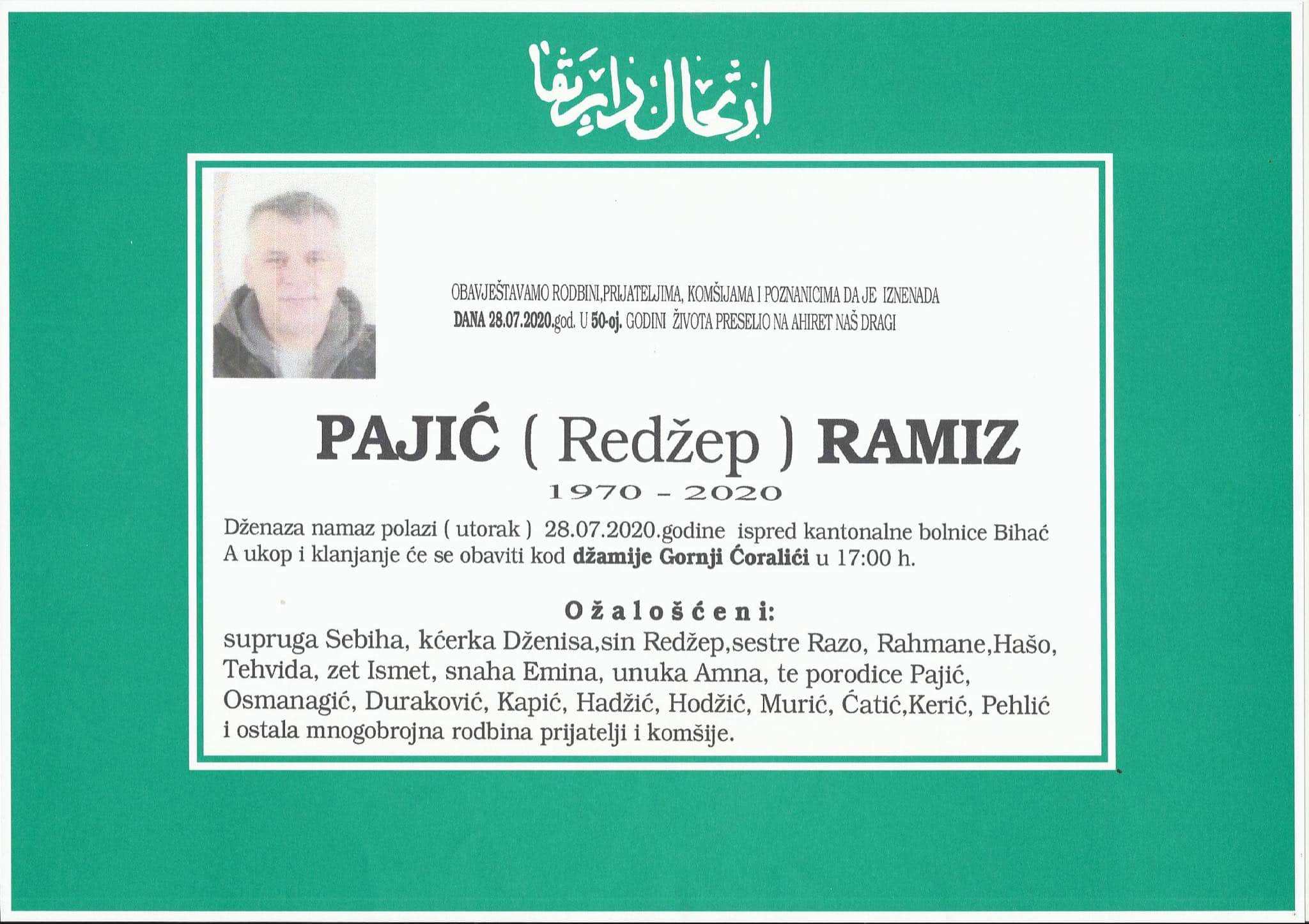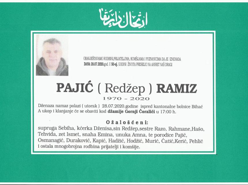 Tužnog srca i s bolom u duši obavještavamo rodbinu, komšije i prijatelje da je naš dragi Pajić (Redžep) Ramiz, dana 28. jula 2020. godine, u 50. godini života, preselio na Ahiret.