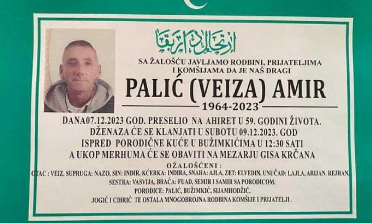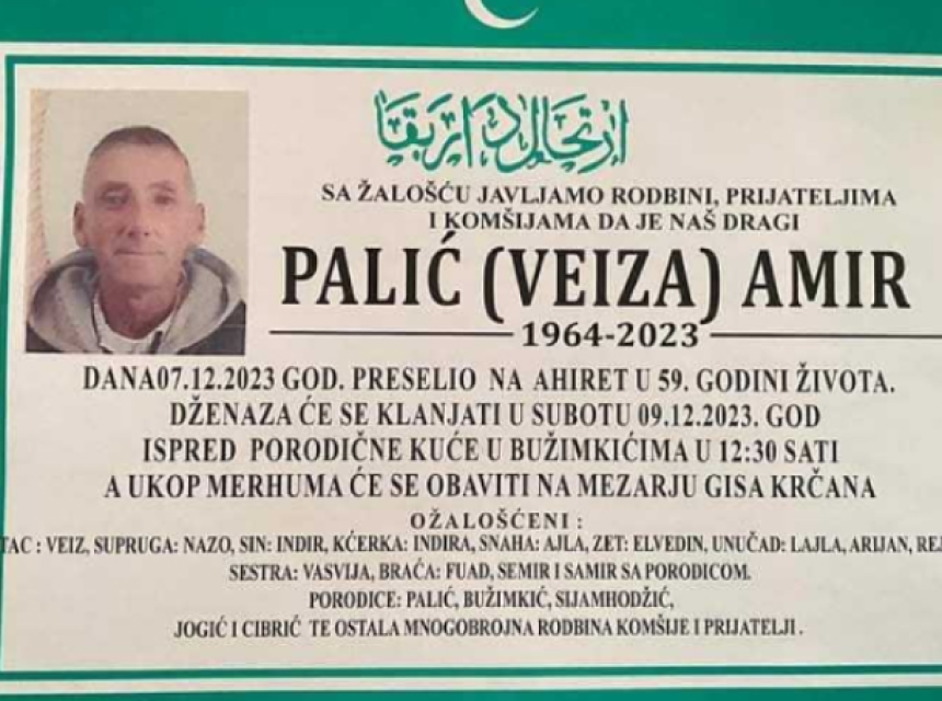 SA ŽALOŠĆU JAVLJAMO RODBINI, PRIJATELJIMA I KOMŠIJAMA DA JE NAŠ DRAGI PALIĆ (VEIZA) AMIR DANA 07.12.2023 GOD. PRESELIO NA AHIRET U 59. GODINI ŽIVOTA.