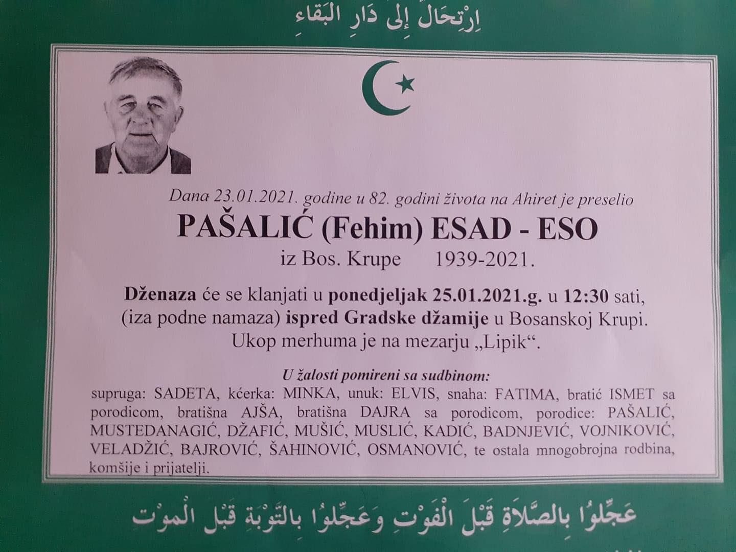 Tužnog srca i s bolom u duši obavještavamo rodbinu, komšije i prijatelje da je naš dragi Pašalić (Fehim) Esad - Eso, dana 23.01.2021. godine u 82. godini života preselio na Ahiret.