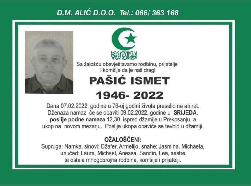Tužnog srca i s bolom u duši obavještavamo rodbinu, komšije i prijatelje da je naš dragi Pašić Ismet 07.02.2022. u 76. godini života preselio na ahiret.