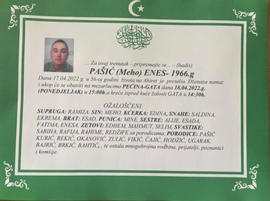 Tužnog srca i s bolom u duši obavještavamo rodbinu, komšije i prijatelje da je naš dragi Pašić (Meho) Enes u 56. godini života preselio na Ahiret.