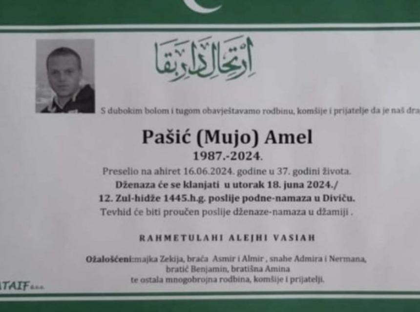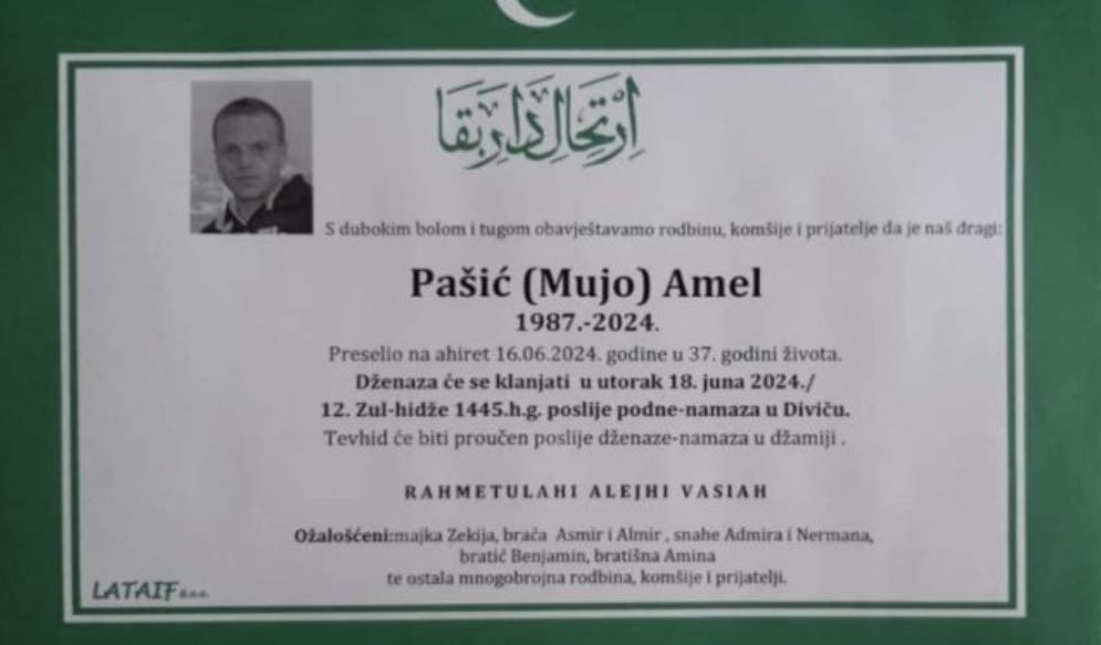 Obaviještavamo rodbinu, prijatelje i poznanike da je u nedjelju 16.06.2024. godine u 37-oj godini na Ahiret preselio Pašić (Mujo) Amel.