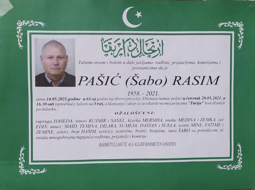 Tužnog srca i s bolom u duši obavještavamo rodbinu, komšije i prijatelje da je naš dragi Pašić (Šabo) Rasim, dana 14.05.2021. godine, u 63-oj godini života preselio na Ahiret.