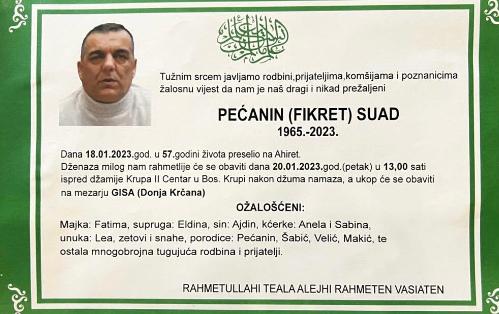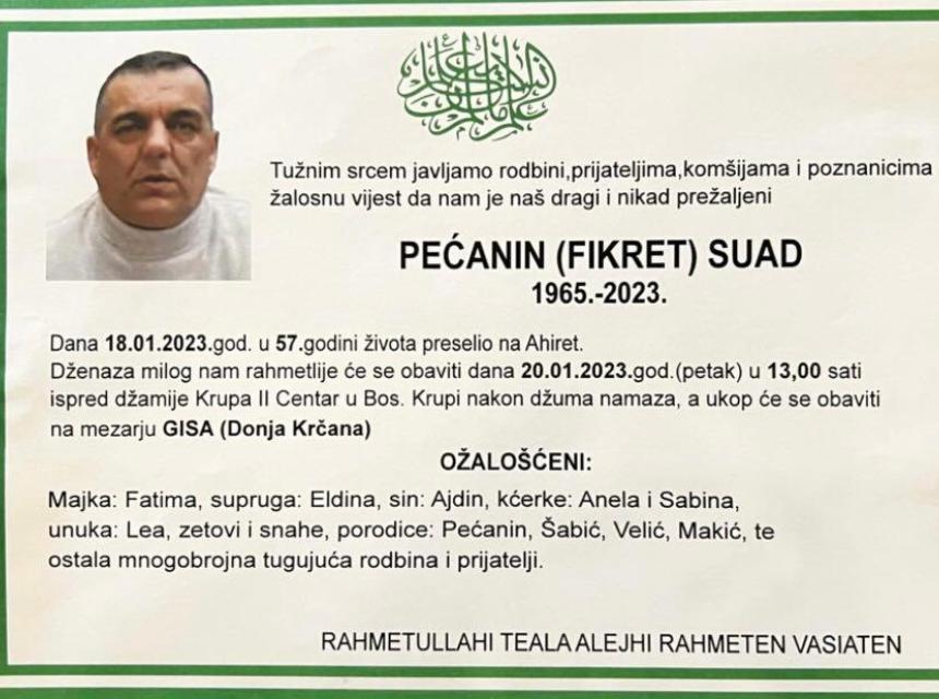 Tužnim srcem i bolom u duši javljamo rodbini, prijateljima i poznanicima da je naš Pećanin (Fikret) Suad, dana 18.01.2023. godine u 57-oj godini života, preselio na Ahiret.