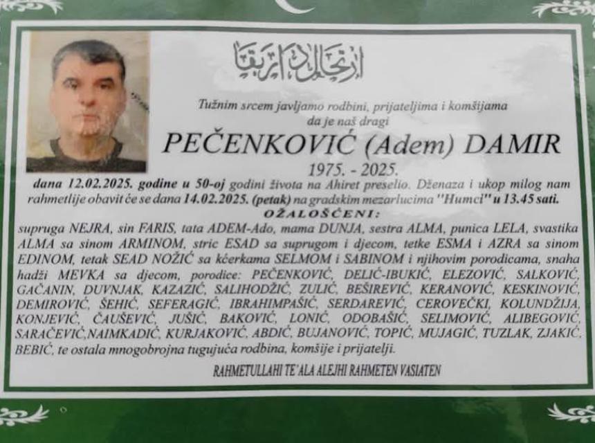 Tužnim srcem i bolom u duši javljamo rodbini, prijateljima i komšijama da je naš dragi Pečenković (Adem) Damir, dana 12.02.2025. godine u 50-oj godini života, preselio na Ahiret.
