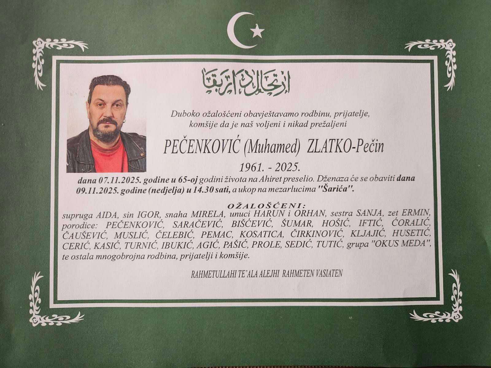 Tužnim srcem i bolom u duši javljamo rodbini, prijateljima i komšijama da je naš dragi Pečenković (Muhamed) Zlatko - Pečin, dana 07.11.2025. godine u 65-oj godini života, preselio na Ahiret.