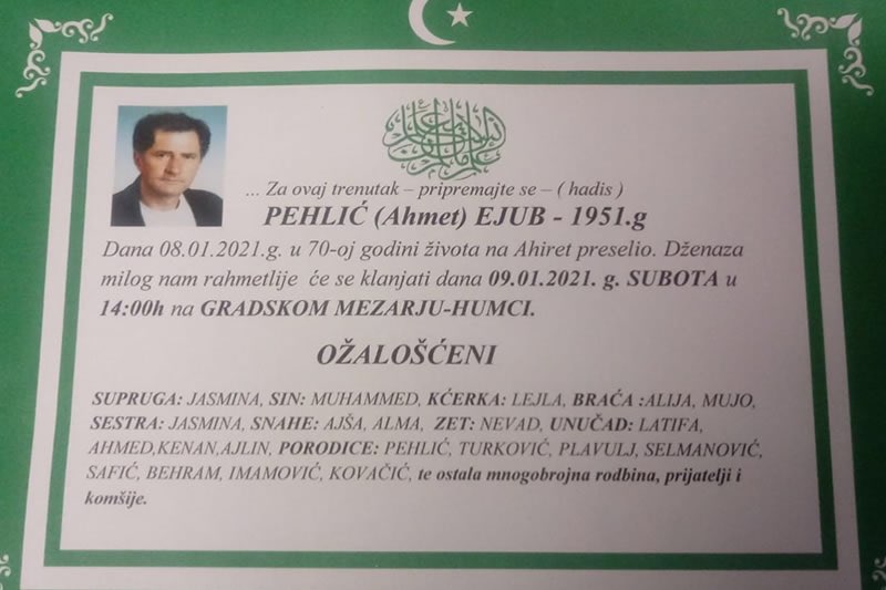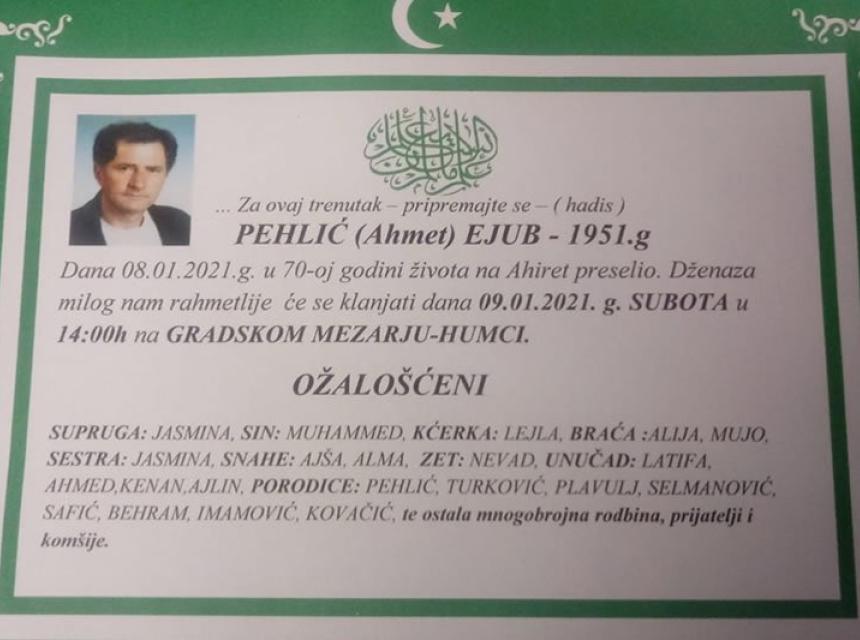 Tužnog srca i s bolom u duši obavještavamo rodbinu, komšije i prijatelje da je naš dragi Pehlić (Ahmet) Ejub 08. januara 2021. godine, u 70. godini života preselio na Ahiret.