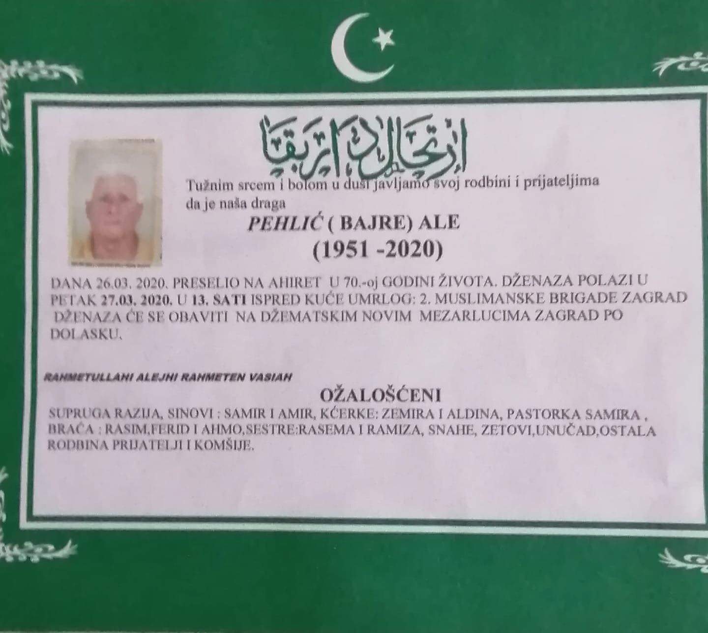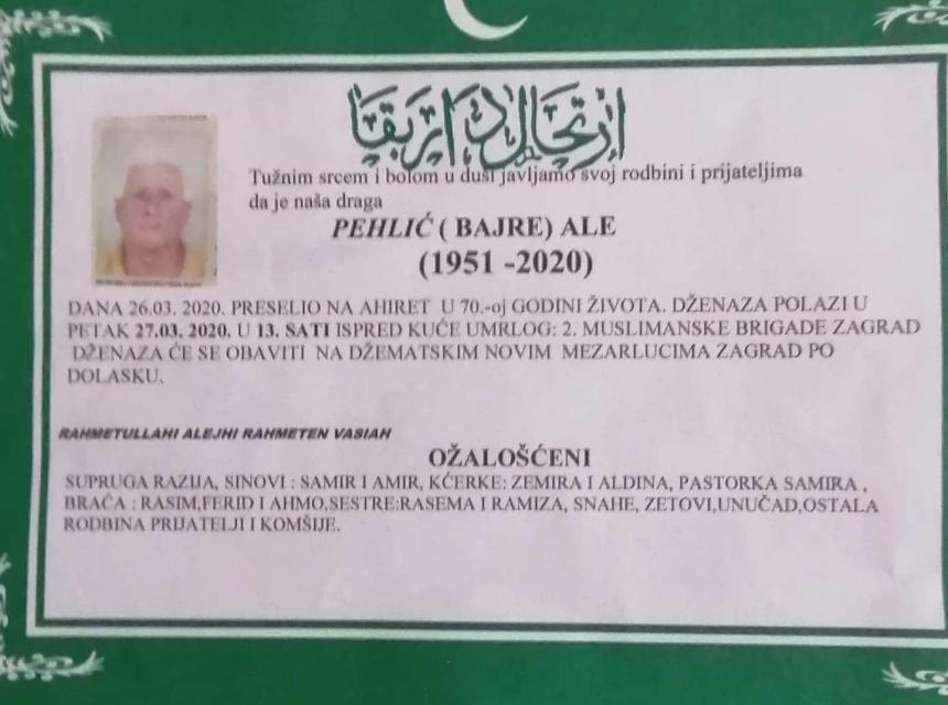 Dženaza namaz polazi u petak 27.03.2020 godine u 13 sati ispred kuće umrlog. Dženaza će se obaviti na džematskim novim mezarlucima ZAGRAD po dolasku.