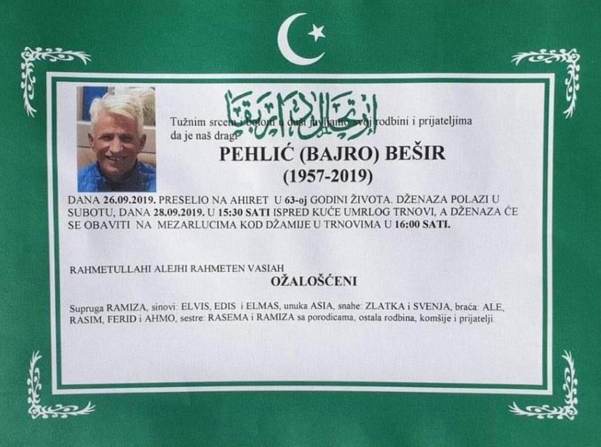 Tužnim srcem i bolom u duši javljamo rodbini i prijateljima da je naš dragi Pehlić (Bajro) Bešir dana 26.09.2019.godine na Ahiret preselio u 63.-oj godini života.