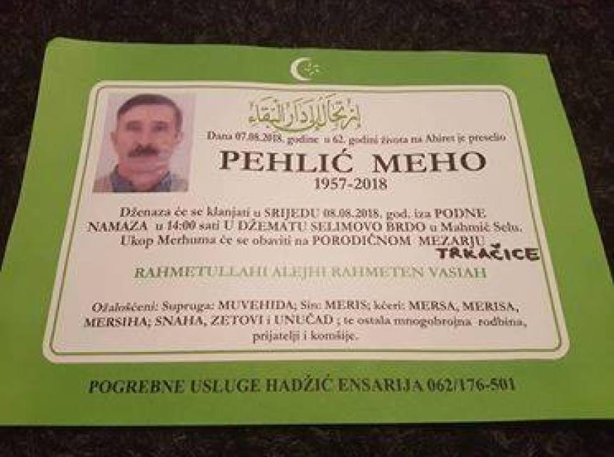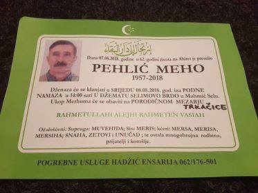 Dana 07.08.2018.godine u 62-oj. godini na Ahiret je preselio Pehlić Meho.