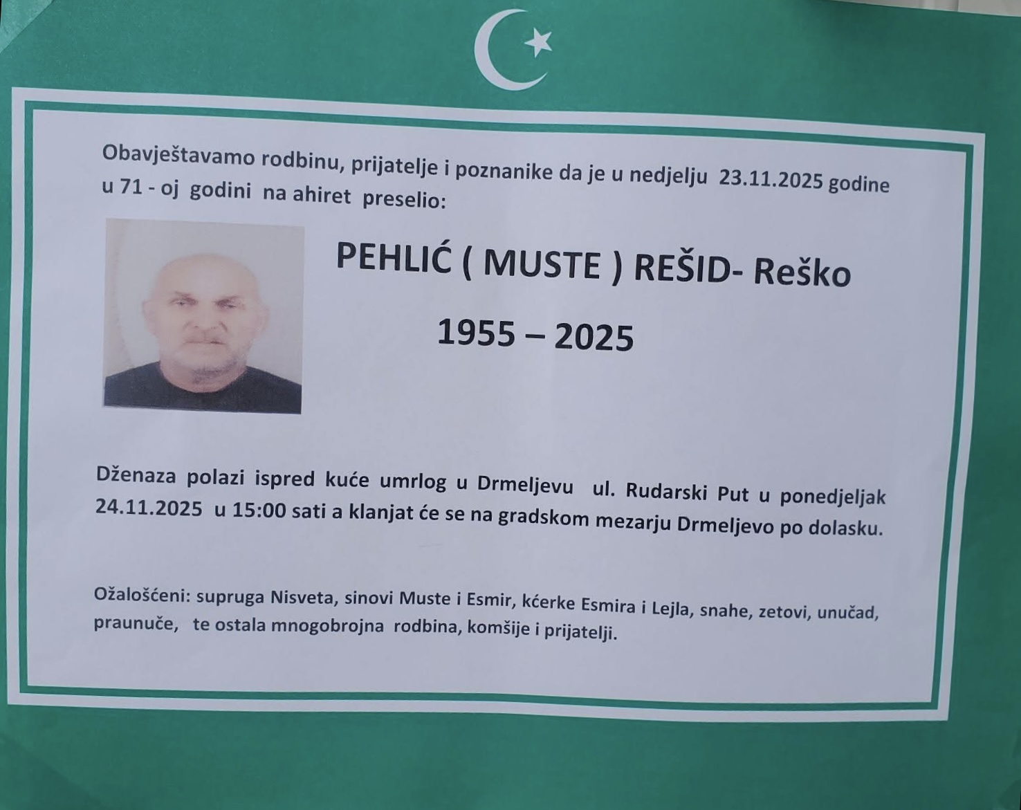 Dženaza polazi ispred kuće umrlog u Drmeljevu, ul. Rudarski put, u ponedjeljak 24.11.2025. u 15:00 sati, a klanjat će se na gradskom mezarju Drmeljevo po dolasku.