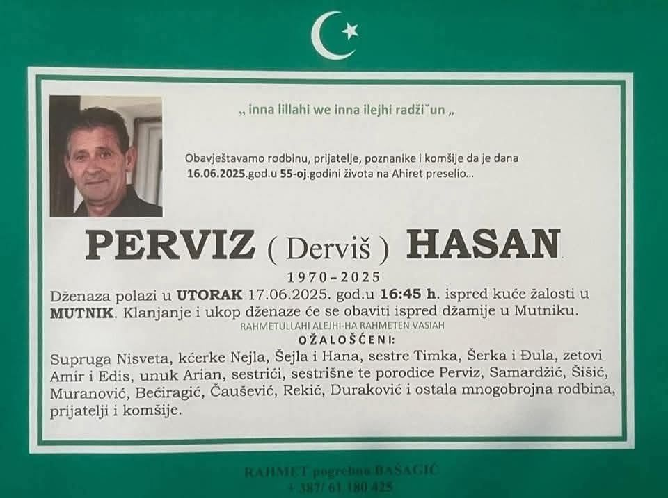 Dženaza kreće u utorak 17.06.2025. godine u 17:30h ispred kuće žalost u Mutnik, a klanjanje i ukop će se obaviti ispred džamije u Mutniku.