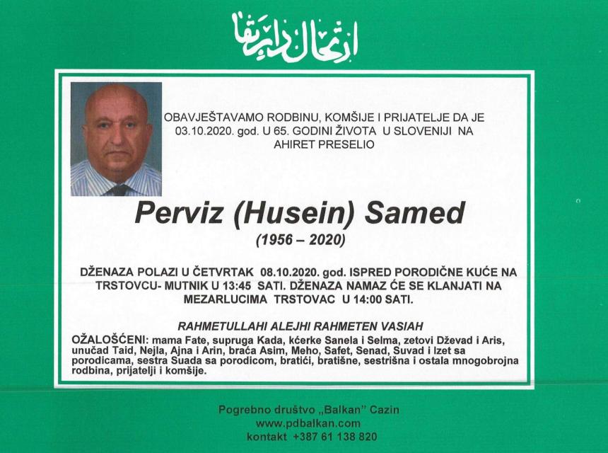 Tužnog srca i s bolom u duši obavještavamo rodbinu, komšije i prijatelje da je naš dragi Perviz (Husein) Samed, dana 03.10.2020. godine, u 65-oj. godini života, preselio na Ahiret.