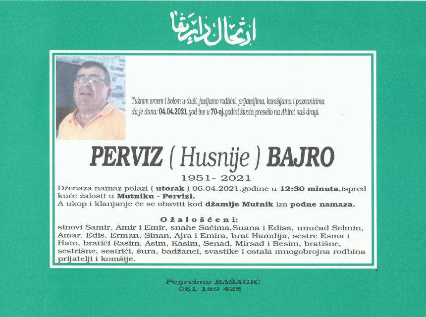 Tužnog srca i s bolom u duši obavještavamo rodbinu, komšije i prijatelje da je naš dragi Perviz (Husnije) Bajro, 04.04.2021. godine, u 70. godini života preselio na Ahiret.