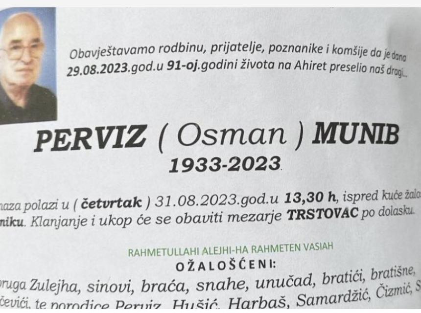 Tužnim srcem javljamo rodbini, prijateljima i komšijama tužnu vijest da nam je naš dragi Perviz (Osman) Munib dana 29.08.2023. godine na ahiret preselio u 91-oj godini života