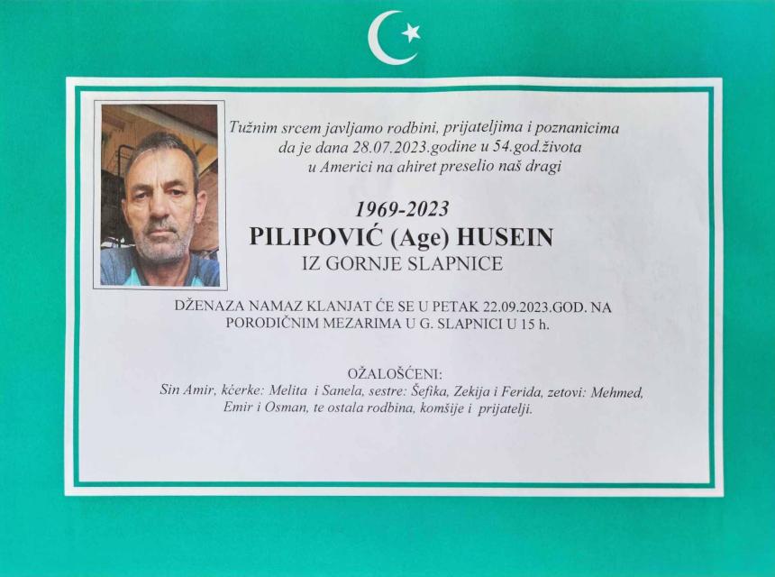 Obavještavamo rodbinu, prijatelje i komšije da je naš dragi Pilipović (Age) Husein dana 28.07.2023.godine u 54-oj godini života preselio na Ahiret.