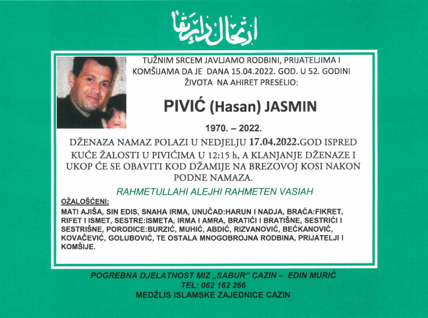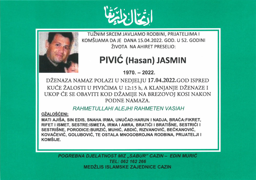 Tužnog srca i s bolom u duši obavještavamo rodbinu, komšije i prijatelje da je naš dragi Pivić (Hasan) Jasmin, dana 15.04.2022. godine, u 52-oj godini života, preselio na Ahiret.