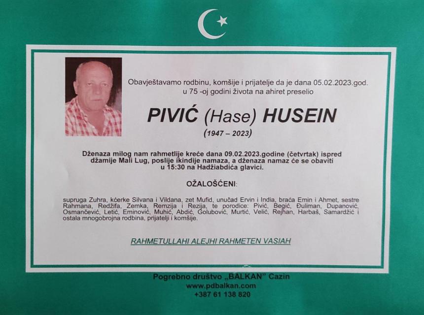 Sa žalošću javljamo rodbini, prijateljima i poznanicima da je nap dragi Pivić (Hase) Husein dana 05.02.2023 god preselio na Ahiret u 75 godini života.