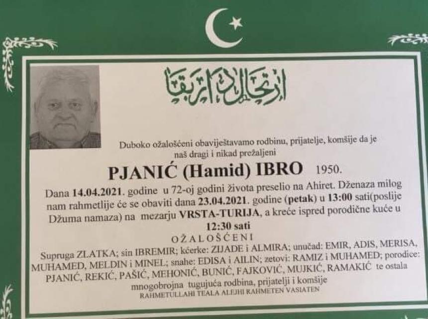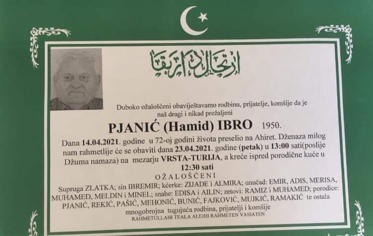 Tužnog srca i s bolom u duši obavještavamo rodbinu, komšije i prijatelje da je naš dragi Pjanić (Hamid) Ibro, 14.04.2021. godine, u 72-oj godini života, preselio na Ahiret.